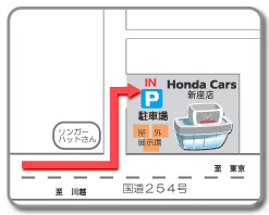 国道254号(川越街道)からの出入りは大変危険なため、リンガーハットさんと当店の間の側道を左折してください。
